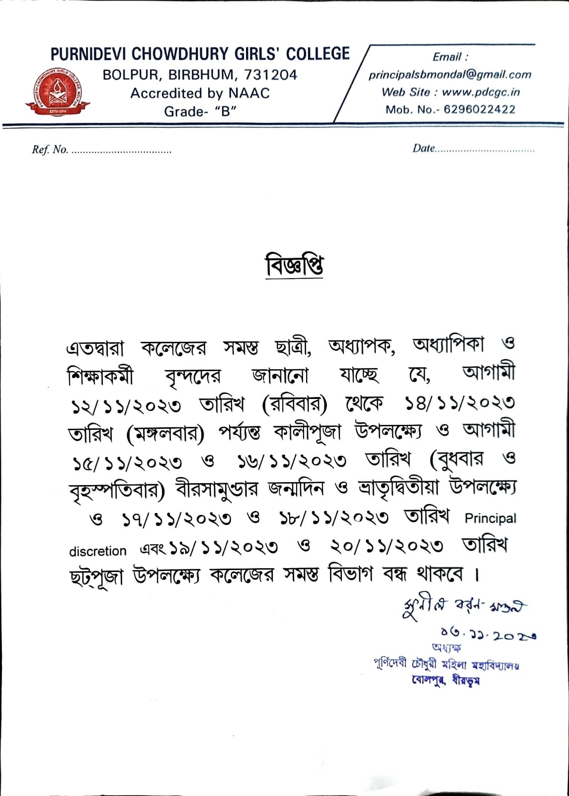 College contacts e-mail :principalsbmondal@gmail.com